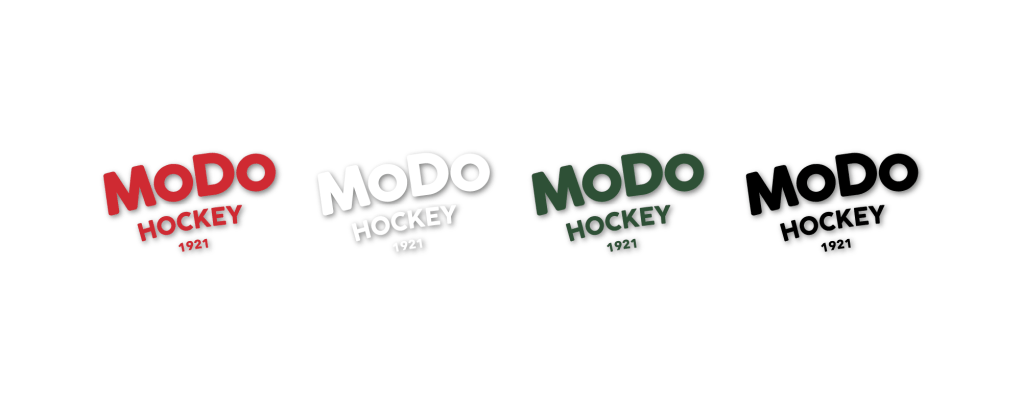 På den översta bilden ser vi text på logotypen frilagd. Denna typ av bild skulle kunna användas på exempelvis tröjor, brev eller reklam som en förenklad version av logotypen där fokus är på namnet. Texten är ordnad efter storlek och börjar med det viktigaste, ”MoDo” i störst storlek, sedan ”Hockey” och slutligen grundningsåret längt ner i minst storlek.