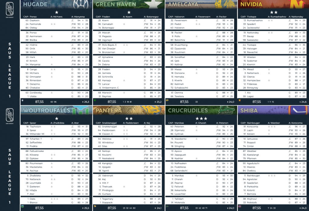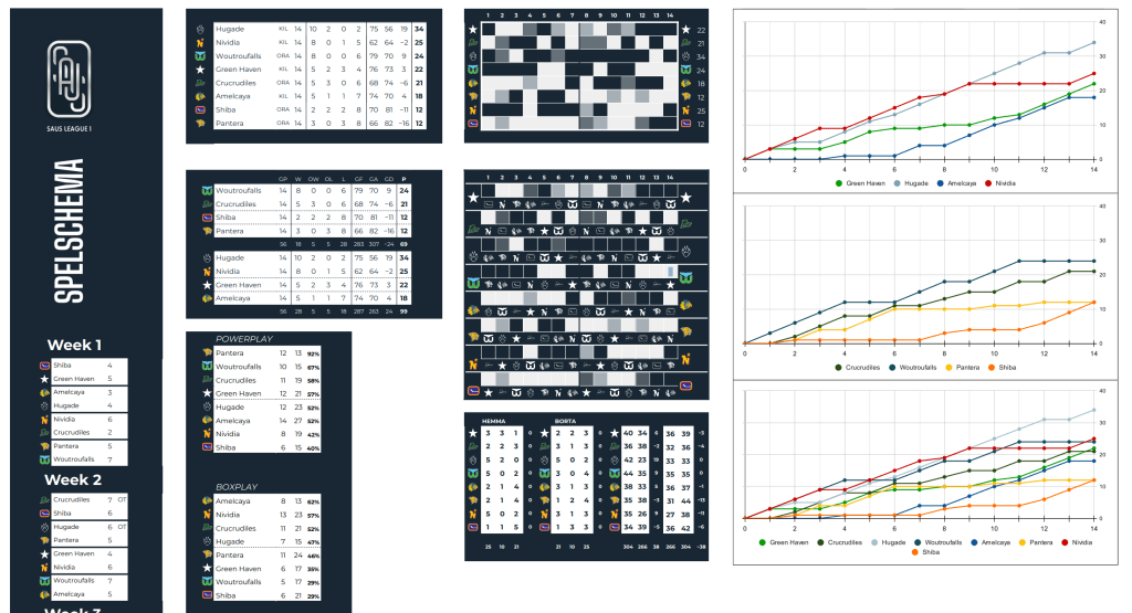 SAUS LEAGUE är en virtuell ishockeyliga som jag är en av arrangörerna av och har skapat all design och informationsvisualisering kring. Det är ett projekt som jag aktivt utvecklat över sex års tid vid sidan av jobb och studier. Det huvudsakliga arbetet har gjorts i Excel men grafiska element och animationer har gjorts i program som Illustrator och After Effects.